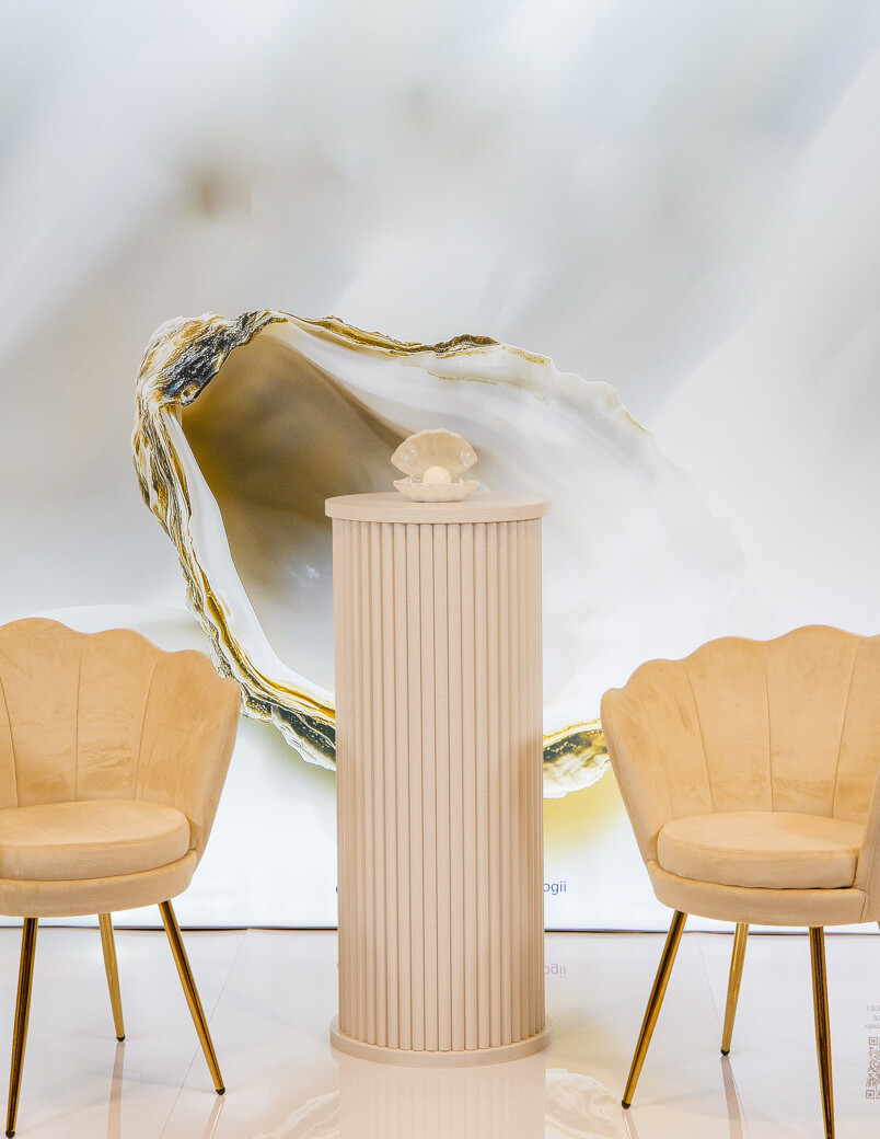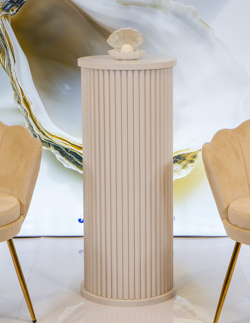 Ryflowany postument w kolorze złamanej bieli (Vanilla Cream). Okrągły kształt sprawia, że doskonale prezentuje wazony, kompozycje kwiatowe lub dekoracje eventowe. Idealny jako element aranżacji ślubnych, galowych i fotograficznych.