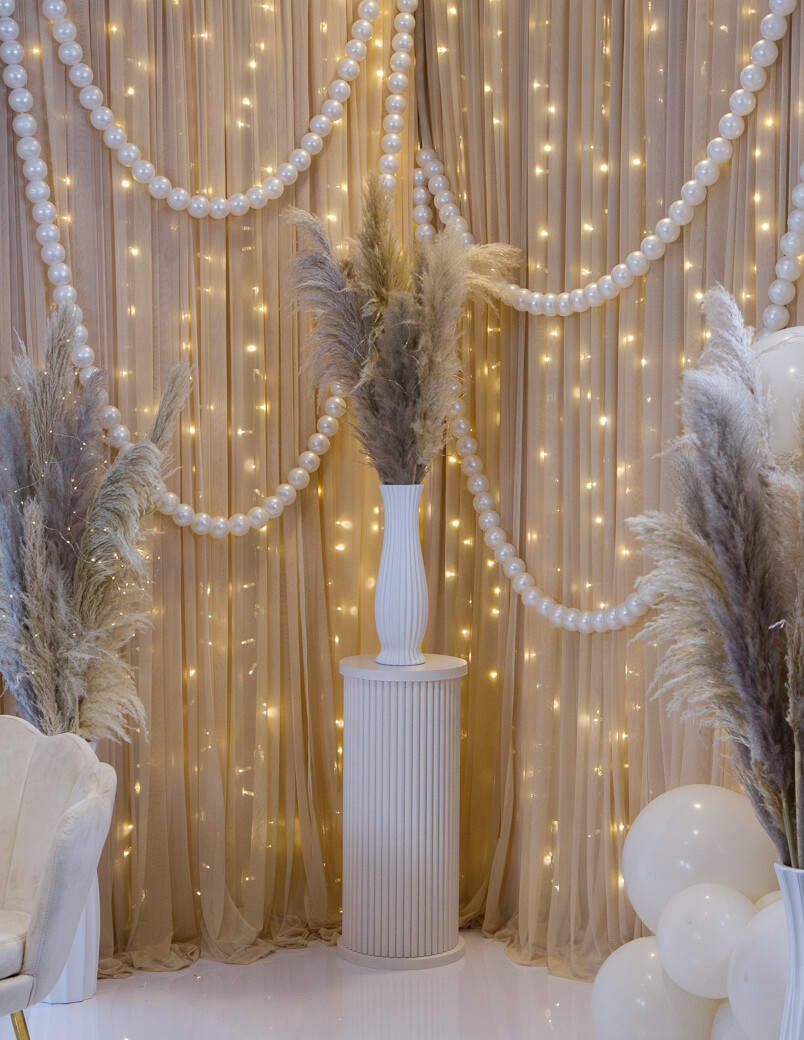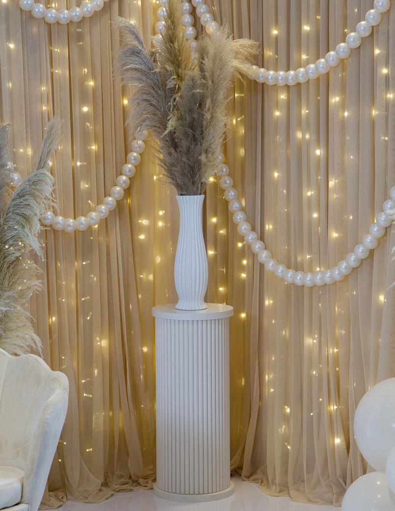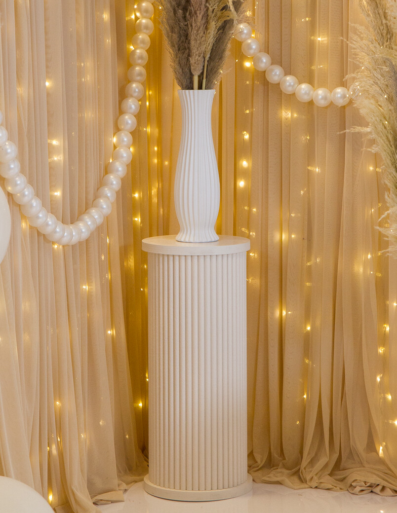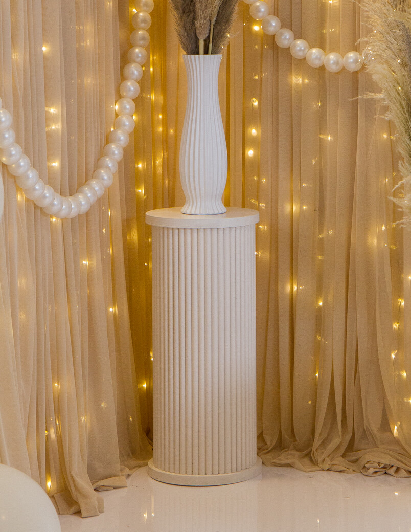 Ryflowany postument w kolorze złamanej bieli (Vanilla Cream). Okrągły kształt sprawia, że doskonale prezentuje wazony, kompozycje kwiatowe lub dekoracje eventowe. Idealny jako element aranżacji ślubnych, galowych i fotograficznych.